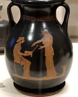 Free-born male citizens held political, social and economic power within the domestic and public sphere, as evidenced by the vast amount of historical records available regarding inheritance, property rights, and trade agreements.[6] Ancient law books and surviving artwork reveal inheritance and property rights favoring male kin and even male non-kin over the women of the household. The practice of exposing new born female babies revealed a society that favored the male sex.[6] The creation of specific rooms in the house designated for male-only socialization appeared at a certain point in the Classical Greek period. The practice of holding symposium, within the andrōn for the possible purpose of arranging economic agreements within the male aristocratic community, is alluded to in many ceramic vases and murals.[7] It is in sifting through these surviving remnants of the domestic sphere that archeologists have been able to piece together an understanding of women's social, economic, and political realities.