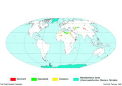 Gypsisols are exclusive to arid regions; their worldwide extent is probably of the order of 100 million hectares. Major occurrences are in and around Mesopotamia in desert areas in the Middle East and adjacent central Asian republics, in the Libyan and Namib deserts, in southeast and central Australia and in the southwestern United States.