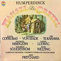 Hänsel und Gretel is a 107-minute studio album of Engelbert Humperdinck's 1893 opera of the same name, performed by Ileana Cotrubaș, Dame Kiri Te Kanawa, Christa Ludwig, Siegmund Nimsgern, Elisabeth Söderström, Frederica von Stade and Ruth Welting with the Children's Chorus of Cologne Opera and the Gürzenich Orchestra under the direction of Sir John Pritchard. It was released in 1979.