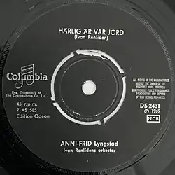 "Härlig är vår jord" is a Swedish pop song by Anni-Frid Lyngstad from 1969 written and conducted by Ivan Renliden. Lyngstad performed it in Melodifestivalen 1969 where it finished in fifth place with eight points.[3][2]