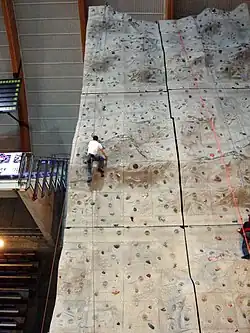 Håkons Hall Sports Centre is part of the complex which supplements the main hall with a recreational training facility. It can make use of the main hall for two handball or football courts, or six volleyball or badminton courts. In addition, there is a permanent health club, a climbing wall, an aerobic room, a golf center with two golf simulators and a putting green, and two badminton courts, all served by 13 changing rooms.[11] The venue also features a 370 meters (1,210 ft) long running track.[12] The cooling and heating systems for Håkons Hall and Eidsiva Arena are connected, allowing them to function as energy reserves for each other.[8]