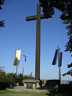 Konrad Martin, Bishop of Paderborn from 1856 to 1875, was born in nearby Geismar. In his honor, a steel cross was erected on top of the Hülfensberg[7] and dedicated on 7 August 1933.[18] The cross is 18.60 m (61.0 ft) tall.[10] It was taken down in 1990, restored and put back up in May 1991.[2] In March 1990, after the Unification of Germany, a plaque was dedicated at the foot of the cross to remember the "victims of the fascist and stalinist dictatorship".[2]