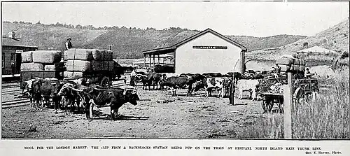 A plan for the proposed station was made in 1903. Tenders were invited on 4 March 1907.[15] On 7 June 1907 a contract was let to A S Johnston of Hunterville for £2,201.0s.7d and the station was built by January 1908. When opened it was 66 ft (20 m) by 14 ft (4.3 m), with rooms for stationmaster, luggage, a lobby, urinals and ladies, on a 240 ft (73 m) by 15 ft (4.6 m) platform. There was also a 40 ft (12 m) by 30 ft (9.1 m) goods shed with verandah, a loading bank, cattle yards, two 4,000 imp gal (18,000 L) water tanks and a cart approach. Cottages for railway staff were built from 1904 to 1955. A crossing loop could take 54 wagons and a snowplough was kept at the station.