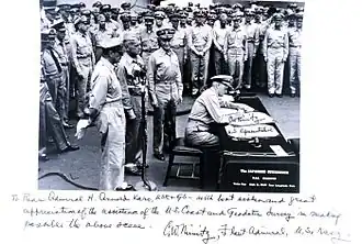 A handwritten inscription on photograph of Admiral Chester Nimitz signing the Japanese surrender document reads, "To Rear Admiral H. Arnold Karo, USC&GS -- with best wishes and great appreciation of the assistance of the U.S. Coast and Geodetic Survey in making possible the above scene." C.W. Nimitz, Fleet Admiral, U.S. Navy.