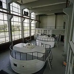 The interior of the main block contains the engine room, which holds two vertical centrifugal pumps driven by three-phase motors.[2] These pumps remove a combined 1,160 cubic metres (41,000 cu ft) of water (1.16 million litres [260,000 imp gal; 310,000 US gal]) per minute;[4] as of 2002, the canal is 5.2 metres (17 ft) lower than the Veluwemeer. Most of the engine room is open, showing the concrete truss construction, though an enclosed area contains a battery for the transformer as well as a diesel generator.[2]