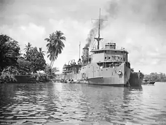 After this, Ping Wo was paid off by the RN on 19 May 1942 and then chartered and commissioned into the RAN on 22 May 1942.[4] As HMAS Ping Wo, the vessel sailed to the east coast of Australia and was initially used as a tender at the joint Australian-United States amphibious training centre at HMAS Assault, Port Stephens.[5] HMAS Ping Wo was later used as a stores ship and from January 1945 as a repair and works depot vessel in the New Guinea theatre of operations, winding up as the RAN administrative headquarters at Madang.