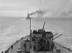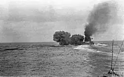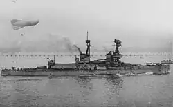 During June–September 1917, Bellerophon served as the junior flagship of the 4th BS, flying the flag of Rear-Admiral Roger Keyes and then Rear-Admiral Douglas Nicholson, while the regular flagship, Colossus, was being refitted.[13] The ship was present in Scapa Flow when the battleship Vanguard's magazines exploded on 9 July and her boats rescued two of the three survivors. A large piece of wreckage landed on her deck.[28] Captain Vincent Molteno assumed command on 13 February 1918.[13] Along with the rest of the Grand Fleet, she sortied on the afternoon of 23 April after radio transmissions revealed that the High Seas Fleet was at sea after a failed attempt to intercept the regular British convoy to Norway. The Germans were too far ahead of the British, and no shots were fired.[29] Captain Francis Mitchell relieved Molteno on 12 October.[13] The ship was present at Rosyth, Scotland, when the German fleet surrendered on 21 November and Bellerophon became a gunnery training ship in March 1919 at the Nore as she was thoroughly obsolete in comparison to the latest dreadnoughts.[17] Mitchell was relieved by Captain Humphrey Bowring on 15 March.[13] She was replaced as a training ship by her sister ship, Superb, on 25 September and was reduced to reserve at Devonport where Bellerophon began a refit that lasted until early January 1920. The ship was scheduled for disposal in March 1921 and listed for sale on 14 August. Bellerophon was sold to the Slough Trading Co. on 8 November 1921 for £44,000 and was resold to a German company in September 1922. The ship departed Plymouth, under tow, for Germany on 14 September and was subsequently broken up.[30]