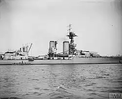 By 18 December 1919, Centurion had been assigned to the 4th Battle Squadron of the Mediterranean Fleet.[32] In March 1920, the ship was temporarily placed in reserve, but was recommissioned on 8 August.[15][33][34] During the Allied intervention in the Russian Civil War, Centurion participated in an exchange of prisoners of war with the victorious Bolsheviks in Georgia in October–November. After the destroyer Tobago struck a mine near Trebizond on 12 November, she was towed from Constantinople to Malta for permanent repairs by Centurion. In April 1921, the ship was again reduced to reserve, recommissioning on 1 August 1922 before the Chanak Crisis of September. Upon her return home in April 1924, she became the flagship of the Reserve Fleet at Portsmouth and participated in a fleet review in Torbay on 26 July. Centurion was transferred to Chatham Dockyard at the end of the year and remained there through 1925.[35]