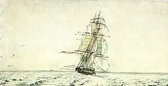 ![]() HMS Doris rounding to under all sail to pick up a man in 1828