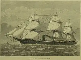 The Emerald class was a class of composite screw corvettes designed by Nathaniel Barnaby for the Royal Navy. The ships were a development of the preceding Amethyst class that replaced wooden construction with one that combined frames and keels of wrought iron, a stem and stern post of cast iron and a cladding of teak. The additional longitudinal strength of the metal frames were designed to afford the opportunity to build in finer lines, and thus higher speeds. The ships did not deliver this better performance, partly due to poor underwater design, and also were prone to oscillate in heavy weather.[1] In service, however, they proved to be good sailing vessels in harsh weather.[2][3] The ships were later redefined as third-class cruisers.[4] Garnet was the last of the class to be laid down.[5]