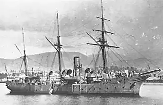 Mutine was launched at Birkenhead on 1 March 1900,[6] and commissioned later the same year.[1] She was re-commissioned at Sheerness 28 November 1901 by Commander Claude William Manners Plenderleath, with a complement of 105 officers and men, for service on the China Station.[7] After successful steam trials in the North Sea, she left Sheerness for China in mid December,[8] arriving at Singapore 4 February,[9] and at Hong Kong 27 March 1902.[10] She served in the Far East between December 1903 and February 1905 and was converted to a survey ship in May 1907.[1] After a year operating off the west coast of Africa, Mutine returned to Devonport for a refit in July 1908.[11]