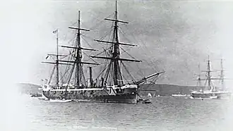 Initially on service with the Cape of Good Hope and West Africa Station, Rapid commenced service on the Australia Station in 1886. She was recommissioned three times in Sydney before leaving the Australia Station on 1 December 1897.[3] In March 1902, it was announced that she would be sold out of service owing to defects in her machinery.[4] Six months later, she was instead posted to Gibraltar where she arrived for dockyard work in September 1902.[5] Hulked in 1906, she was converted into a coal hulk in 1912 and was renamed C7. She became an accommodation ship in 1916 and was renamed Hart. She was sold at Gibraltar in 1948.[3]