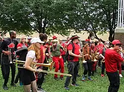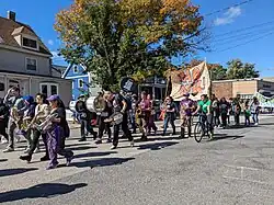 The longest-running HONK! has taken place in Somerville, Massachusetts' Davis Square neighbourhood every October since 2006.[2] It was begun by a committee of members from a Somerville activist band, The Second Line Social Aid and Pleasure Society Brass Band, who saw the need for a gathering of like-minded souls interested in applying the joy of music to the work of promoting peace, social justice, and civic engagement.[3][4][5] Since 2007, it has included a parade titled "Reclaim the Streets for Horns, Bikes and Feet!" The parade features the bands along with other non-musician participants, including puppeteers and visual artists such as the Bread & Puppet Theater and organizations that promote transportation alternatives and environmental and social justice, such as Bikes Not Bombs.[6]