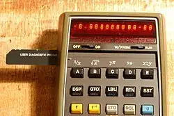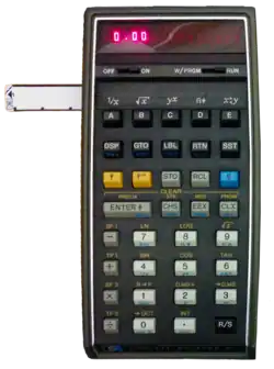 The HP-65 is the first magnetic card-programmable handheld calculator. Introduced by Hewlett-Packard in 1974 at an MSRP of $795[1] (equivalent to $5,069 in 2024)[2], it featured nine storage registers and room for 100 keystroke instructions. It also included a magnetic card reader/writer to save and load programs. Like all Hewlett-Packard calculators of the era and most since, the HP-65 used reverse Polish notation (RPN) and a four-level automatic operand stack.