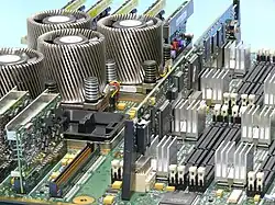The C8000 uses the dual-core PA-8800 or PA-8900 processors, which uses the same bus as the McKinley and Madison Itanium processors and shares the same zx1 chipset. The Elroy PCI adapters have been replaced with Mercury PCI-X adapters and one Quicksilver AGP 8x adapter.