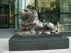 Various headquarters and branch buildings of The Hongkong and Shanghai Banking Corporation (and later the HSBC Group) feature a pair of lion sculptures. The HSBC lions have become distinctive landmarks in their own right in Hong Kong and Shanghai, with further pairs to be found in London and Birmingham.