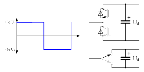 From the very first VSC-HVDC scheme installed (the Hellsjön experimental link commissioned in Sweden in 1997[7]) until 2012, most of the VSC HVDC systems built were based on the two level converter. The two-level converter is the simplest type of three-phase voltage-source converter[29] and can be thought of as a six pulse bridge in which the thyristors have been replaced by IGBTs with inverse-parallel diodes, and the DC smoothing reactors have been replaced by DC smoothing capacitors. Such converters derive their name from the fact that the voltage at the AC output of each phase is switched between two discrete voltage levels, corresponding to the electrical potentials of the positive and negative DC terminals. When the upper of the two valves in a phase is turned on, the AC output terminal is connected to the positive DC terminal, resulting in an output voltage of +1/2 Ud with respect to the midpoint potential of the converter. Conversely when the lower valve in a phase is turned on, the AC output terminal is connected to the negative DC terminal, resulting in an output voltage of −1/2 Ud. The two valves corresponding to one phase must never be turned on simultaneously, as this would result in an uncontrolled discharge of the DC capacitor, risking severe damage to the converter equipment.