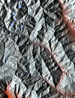 ![]() Relief map showing the passage of the river (centre) flowing towards the south | |
