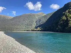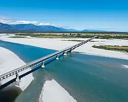 State Highway 6 follows virtually the complete length of the river. From near Haast Pass, the state highway is located on the river's true left. It switches to the true right at the Gates of Haast Bridge. At Pleasant Flat, where the valley widens out, the state highway crosses back to the true left.[3] The final bridge is near the coast, just after the turnoff to the Haast township. At 737 metres (2,418 ft) it is the longest one-lane road bridge in New Zealand, and the 7th longest New Zealand bridge overall.[4]