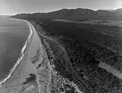 The Haast plain extends 50 km (31 mi) from Ship Creek to Jackson Bay / Okahu. The plain has an unusual landform, with long parallel lines of low hills with narrow swales in between. In some places, the plain is 10 km (6.2 mi) wide, with six rows of dunes and swales. The landform results from the combined effects of sediment carried to the coast by six large rivers, longshore drift and periodic seismic uplifts. The rivers discharging into the Tasman sea in this region of coastline drain from large catchment areas in the Southern Alps, where there is high rainfall and the mountains have high rates of erosion.[5] The suspended sediment yield of the Arawhata River has been reported as 7.18 Mt/yr, and the Haast River as 5.93 Mt/yr. The total estimated suspended sediment yield from rivers in South Westland is over 50 Mt/yr.[6] Longshore drift leads to much of this sediment being deposited along the Haast coastline, forming dunes. The Alpine Fault runs along the inland edge of the plain, and the entire area is subject to tectonic uplift during major seismic events. Following a major uplift, existing dunes are no longer exposed to the action of the sea, and new dunes begin to form. This creates a longitudinal pattern of dunes with low-lying wetlands in between. The coastal plain is approximately 6,000 years old. The dunes close to the current shoreline have little vegetation, but the older dunes further inland are forested with tall podocarps. The swales contain wetland lakes, pakihi and kahikatea swamp forests.[5]