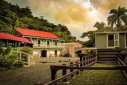 The hacienda today is made up of an 87-acre (350,000 m2) agricultural complex. Its main buildings are grouped together in a 3-acre (12,000 m2) central area and the property includes 11 original buildings: the hacienda manor house, the carriage house, the horse stables, the mule stables, the caretaker's house and office, two warehouses, a hurricane shelter, the corn mill, and the slave quarters. There is a water canal system that is still operative, an aqueduct, and a house garden. The coffee bean processing building was rebuilt to look like the original 1892 building.[20]