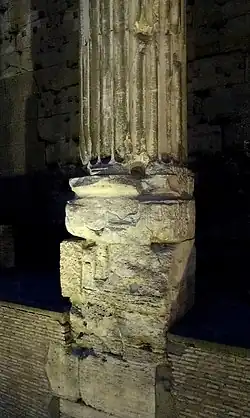 Excavations began in 1878 and recent explorations in the cellars of the buildings on other sides of Piazza di Pietra identified line of a monumental enclosure wall, with large curving exedra at the back.[3] The front of colonnade behind the railing was also thoroughly excavated which exposed original ground level of temple precinct, 5 m below present square and flank of high podium faced with white marble to match columns above.[3]