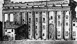 The Temple of Deified Hadrian was located within the Campus Martius (The Field of Mars) in close proximity to the earlier Solarium Augusti and later constructed Column of Marcus Aurelius. In the Notitia it is also listed as located in Regio IX near the Baths of Alexander Severus and Agrippa.[2] The temple of Matidia (Hadrian's mother-in-law) also likely stood just to the west of the Temple of Hadrian so it has further been argued for the presence of monumental entrances at both ends of the temple though the remains offer no confirmation.[2] The temple itself also stood within a spacious precinct surrounded by a colonnade, parts of which were uncovered by Rodolfo Lanciani in his early excavations of the surrounding spaces.[2]