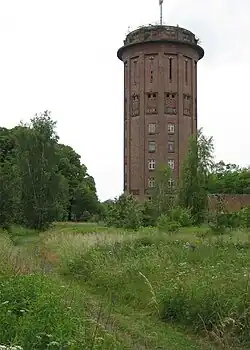 As a starting point of the first railway line towards Mecklenburg-Schwerin Hagenow Land station was equipped with the standard equipment for the maintenance and repair of railway rollingstock. These still exists, but in a highly dilapidated condition. There was a depot (Bahnbetriebswerk), which was located on the south side of the line towards Ludwigslust. It had among other things, a roundhouse with ten stalls and a turntable. Another very similar building nearby suggests a second roundhouse, but all traces of a turntable and sidings that probably once existed have disappeared. There are other sidings and a shed on the property. A former water tower, which is about 30 m-high, is located near the station building. This eleven-storey high, Brick Expressionist construction was built in 1926.[8] It is in a highly dilapidated condition and is a heritage-listed building.[9]