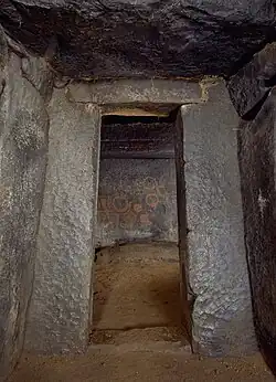 It is an enpun (円墳)-style circular tumulus, with a diameter of 21 meters and a height of about five meters, with a side cave-style horizontal entry stone burial chamber facing west.[2] According to an archaeological excavation conducted in 2000, it was built around the end of the 6th century, based on excavated earthenware. The chamber is divided into a vestibule and the burial chamber proper, and the burial chamber consists of an anterior chamber and a posterior chamber. Each chamber was constructed by placing huge cut monoliths of tuff as foundations at the bottom of the walls and stacking split stones at the top, and the ceilings are quite high. The posterior chamber has a floor width of approximately 2.67 meters, a length of approximately 2.9 meters, and a height of approximately 3 meters. There is a stone shelf on the back wall, and the wall below it has designs in red pigment. The designs can be broadly divided into two groups, and the group on the upper right shows two gondola-shaped boats and a circular pattern with a dot in the center lined up one above the other. There is also an ellipse below the ship on the left. The group on the lower left has decorations that look like shields or bows, but the basic motifs are geometric patterns based on circular and triangular patterns. Documents indicate that there used to be decorations on the right wall of the burial chamber, but this cannot be confirmed today. The burial chamber has been opened for centuries, and an inscription dated 1692 was found carved into one of the stones.[2]