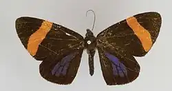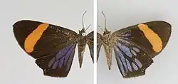 The uppersides and undersides of the wings are very similar, with the colour of the hindwings generally being paler. The forewings feature a deep-orange transversal band on a dark brown background, and the hindwings show metallic-blue fields between the veins, with three located on the upperside between M3 and CuA2 and one in the cell, and eight between all veins on the underside. The pattern of the female is similar, with the blue fields extending further on the forewing, including the blotch between veins CuA2 and A. In the female, metallic-blue scales are also present at the base of the forewing at both the wing upperside and underside.[1]