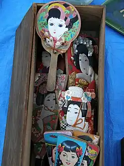 Hagoita were introduced into Japan during the Muromachi period (1336–1573) from Ming dynasty China.[3] In the Edo period (1603–1868), oshie-hagoita were designed with images of elegantly made-up kabuki actors (oshie meaning raised cloth pictures).[1] They were made using washi or cloth cut out in the shape of flowers and people and pasted onto the paddle stuffed with cotton to give them a three-dimensional appearance.[1] Over time, hagoita were not only used as game equipment but also as popular gifts and collectibles. During the Edo and Meiji period, many different kinds appeared; some high-quality paddles even used gold leaf and silver foil.[1] With the industrial revolution, improved manufacturing technology promoted the development of hagoita. Also, among farmers, producing hagoita was a popular off-season side business.