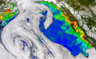 Haida eddies can be more than 250 km in diameter, and transport a mass of coastal water approximately the volume of Lake Michigan over 1,000 km offshore into the lower nutrient waters of the northeast Pacific Ocean.[2] These "warm-core rings" transport heat out to sea, supplying nutrients (particularly nitrate and iron) to nutrient depleted areas of lower productivity. Consequently, primary production in Haida eddies is up to three times higher than in ambient waters, supporting vast phytoplankton-based communities, as well as influencing zooplankton and icthyoplankton community compositions.[3][4]