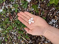 The size of hailstones is best determined by measuring their diameter with a ruler. In the absence of a ruler, hailstone size is often visually estimated by comparing its size to that of known objects, such as coins.[41] Using objects such as hen's eggs, peas, and marbles for comparing hailstone sizes is imprecise, due to their varied dimensions. The UK organisation, TORRO, also scales for both hailstones and hailstorms.[42]