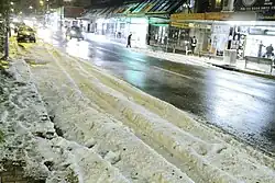 Depths of up to 18 in (0.46 m) have been reported. A landscape covered in accumulated hail generally resembles one covered in accumulated snow and any significant accumulation of hail has the same restrictive effects as snow accumulation, albeit over a smaller area, on transport and infrastructure.[63] Accumulated hail can also cause flooding by blocking drains, and hail can be carried in the floodwater, turning into a snow-like slush which is deposited at lower elevations.