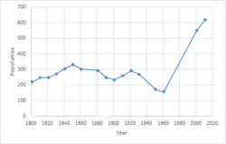 The total numbers of houses follows a similar trend to the population of Haile, increasing to 59 households in 1931, then declining to 49 in 1961.[7] Due to different defining boundaries according to the Neighborhood statistics in 2011 there were 259 households.[8] In 1921 there was on average 6 rooms per house,[9] whereas in 2011 there were on average 8-9 rooms per household.[1]
