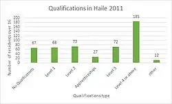 In Haile a total of 504 people are over 16, with 67 of them gaining no qualifications. This is above the national average. In 2011 22.3% of over 16 residents gained no qualifications, whereas in Haile it is a low 13.3%. On average most people have a level 4 or above qualification (185/504). According to the Office for National Statistics in England, 27% of people over 16 have a level 4 or above qualification, however in Haile it is higher at 36.7%.[1] Comparing Haile to the 2001 and 2011 census data shows significant improvements in its education system, with 50% of people having level 3 or above qualifications, compared to 33% in 2001.[12][13]