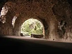 Fifteenth century work includes a roofless chamber in which the remains of what appear to be an ambry and a piscina suggest it was a chapel rather than a hall. There is also a vaulted basement bakehouse and brewhouse from this period.
