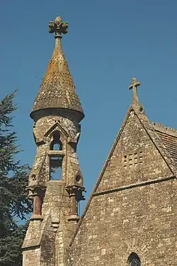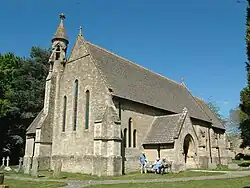A Church of England parish church was built in 1761[2] and extended in 1830.[5] It was demolished and replaced by the present Gothic Revival parish church of St John the Evangelist in 1866–69. It was designed by the young Gothic Revival architect Clapton Crabb Rolfe, whose father Rev. George Crabb Rolfe was the perpetual curate. C.C. Rolfe applied his own interpretation of French Gothic architecture. The Oxford Diocesan Architect G.E. Street condemned his initial designs as "needlessly eccentric", so Rolfe modified them. But Sherwood and Pevsner describe the result as "still odd... a fantastic Gothic in colourful materials with bulbous forms and freakish detail". They single out the bell-turret as "particularly bizarre".[6] The font, sited in the north aisle, is from the preceding Georgian parish church.[2] St John's is a Grade II* listed building.[7] Its parish is part of the Benefice of Witney, which also includes Curbridge.[8]