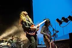 The group has rejected the "girl band" label, preferring to be respected as musicians on their individual merits. Alana stated, "When people call us a girl band, I take it as an insult – being a girl in a band shouldn't be a thing."[47] All three sisters are proficient on more than one instrument: Este plays both guitar and bass, Danielle plays guitar and drums, and Alana plays guitar, keyboards and percussion.[19] For live performances, Este plays bass, Danielle plays lead guitar and sings lead vocals, and Alana plays rhythm guitar along with keyboards and percussion. All three sisters contribute three part vocal harmony.[8][19] As the lead singer, Danielle's contralto vocals have been described as "rich" and "earthy".[124][125][126][127] Elaina Crockett of The Daily Orange has described all three members as altos, observing that they rarely sing beyond this range.[128]