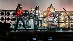 The band's live sound differs from that in the studio. Writing for NME, Hazel Sheffield said that Days Are Gone "may confuse those won over by their raw, rocking live shows."[39] Recordings demonstrate the group's vocal pop style, while the group plays typical rock material such as Fleetwood Mac's "Oh Well" in concert.[18] The group's background in wedding bands from their days as Rockinhaim has led them to cover many different songs live and for radio sessions, including Miley Cyrus' "Wrecking Ball", Sheryl Crow's "Strong Enough" and the Strokes' "I'll Try Anything Once" (an early version of "You Only Live Once").[129][130] Este acts as the group's MC onstage, announcing most of the songs.[18] Many of her on-stage antics, such as her blunt and coarse banter with the audience, frequent illeism and her facial expressions (known as the "bass face") while playing, are staples of the band's live shows and, to a lesser extent, the band's public image.[11]