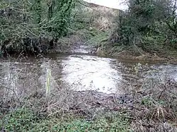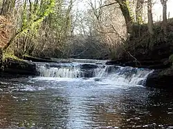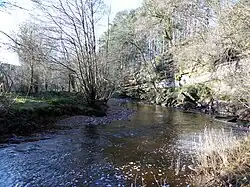 Haining Place or The Haining in the Parish of Kilmarnock lies near an old fording place across the Cessnock Water in East Ayrshire, Parish of Riccarton, Scotland. Hanyng (sic) was the caput or laird's dwelling of the Barony of Haining-Ross[1] with a tower house or keep located in a defensive position on a high promontory of land, half encircled by the river. Later Haining Place may have been a dower house, then a tenanted farm, finally being used as farm workers accommodation. Haining Place is now a ruin following a fire. The old farm of Haining Mains is still located nearby.