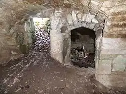 In 1930 the building is described as an 'Old World Mansion on the Cessnock' and it was entered via a tall arched entrance that was topped by a weather vane and flanked by two lions'.[33] It is referred to as 'Haining' or the 'Place of Haining' and a local tradition is recorded that Mary, Queen of Scots once stayed there.[33] The building had two storeys in 1930 with an outside set of steps giving access to the upper or first floor storey, whilst the lower three stone vaulted chambers were only in use as a store. The ground floor windows were narrow slits as the walls were as thick as an ancient keep. The writer speculates that the first floor was built upon a ruined keep and records that the outside steps appeared a 'restoration' addition and that a fanlight of many panes of glass existed above the entrance as found in very old houses. It is further speculated that, as the dwelling has little traditional history attached to it, it may have seen use as dower house to a nearby estate.[33]
