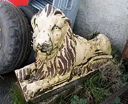 Farms with the name 'mains' were usually associated with mansions as a provider of food, etc for the owners family and servants. The farm is clearly shown on the first OS maps of the 1850s. A lintel over an old door at Haining Mains has the initials 'J W' accompanied by the date '1829' and records show that it was occupied by the Wilson family in the 1870s when David Wilson and his wife Jemima (nee Boyd) lived there with his mother Elizabeth (nee McKerrow).[35] In 1887 the death of James Shaw of Haining Mains is recorded[36] and David Shaw was the farmer here in 1890.[37] The parish cemetery was next to the church in Riccarton. The two recumbent lions that were once located on the entrance wall at Haining Place now reside at the entrance to the yard at Haining Mains. In 1857 a large woodland lay to the east of the farm and well laid out gardens lay behind the house.[28]