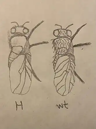It is crucial that proteins HP120 and HP150 are present in the organism as they control the normal activity of H.[4] This activity regulation also controls NSP, which allows the fly embryos to develop correctly, and if there is any fluctuation in the pathway or the proteins, it can change the outcome of the offspring.[4] The two most common changes in the Drosophila phenotype as a result of Hairless mutation are bristle loss and vein gaps.[5] These changes can be seen in Figure 2.