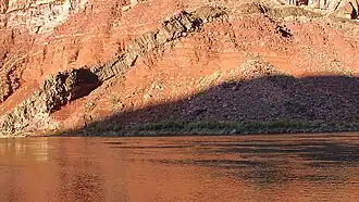 The Hakatai Shale is a Mesoproterozoic rock formation with important exposures in the Grand Canyon, Coconino County, Arizona. It consists of colorful strata that exhibit colors varying from purple to red to brilliant orange. These colors are the result of the oxidation of iron-bearing minerals in the Hakatai Shale. It consists of lower and middle members that consist of bright-red, slope-forming, highly fractured, argillaceous mudstones and shale and an upper member composed of purple and red, cliff-forming, medium-grained sandstone. Its thickness, which apparently increases eastwards, varies from 137 to 300 m (449 to 984 ft). In general, the Hakatai Shale and associated strata of the Unkar Group rocks dip northeast (10–30°) toward normal faults that dip 60° or more toward the southwest. This can be seen at the Palisades fault in the eastern part of the main Unkar Group outcrop area (below East Rim). In addition, thick, prominent, and dark-colored basaltic sills and dikes cut across the purple to red to brilliant orange strata of the Hakatai Shale.[3][4][5]