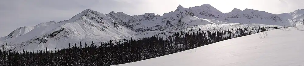 The name derives from the prominent Gąsienica family, common in Zakopane and nearby areas, who owned the pasture in the 17th century. Originally, the name applied only to the pasture and was not its first designation. Locals called it the Pasture of the Ponds, and those grazing there were known as stawiany.[2] In early 19th-century documents, particularly Austrian ones, it was referred to as the Valley of Seven Ponds or, less commonly, the Valley of Five Ponds. Zofia Hołub-Pacewiczowa noted, "The name Hala Gąsienicowa in its current form became established only in recent times".[3] The name later extended to the valley and various features within it.[2]
