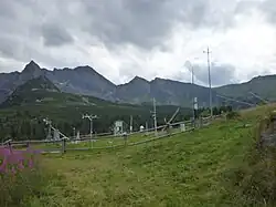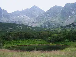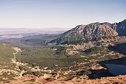 A yellow trail branches left from the Murowaniec mountain hut to Krzyżne pass through Pańszczyca Valley. This trail is relatively easy, with one challenging section near a rocky outcrop on the steep ascent to Krzyżne.[3] Above the mountain hut lies a weather station, the first high-mountain weather station in Polish territory,[4] operating from 1 December 1913 to 1917 as a measurement station for the Natural Sciences Section of the Polish Tatra Society. It is now the Maria and Mieczysław Kłapa Research Station of the Institute of Geography and Spatial Organization of the Polish Academy of Sciences.[5]
