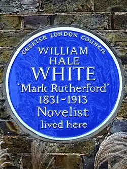 Mark Rutherford School in Bedford is named after him and he has a blue commemorative plaque at 19 Park Hill in Carshalton.[25] There is also a plaque above his birthplace in Bedford that was unveiled by his son, Sir William Hale-White.[26][27] When he retired from the Admiralty in 1892, he lived in Hastings for a number of years where a memorial plaque commemorates him.[7]