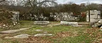Land containing the acreage for Haley Farm State Park was part of a larger parcel granted to John Winthrop, Jr., in 1649. Known as "John Winthrop the Younger," Winthrop was governor of the Saybrook Colony and is often recognized as "Connecticut's first governor." The land was later split up, with the piece containing Haley Farm designated as Fort Hill Farm. The farm was purchased by Starr Chester in 1789 and passed to Noyes Barber in 1833. The land was split again in 1852 with the farm being sold to Henry B. Lewis. Four hundred acres were sold to Caleb Haley in 1869 for the price of $12,000. Haley farmed the land, built stone walls throughout the property and raced horses around "Racetrack Pond." The land passed to his son, Samuel Haley, after his death in 1924. Samuel Haley continued to operate the farm until his death in 1947, when it was passed to his daughter Juliet Haley.[4] The farm produced cream and milk that was shipped to Noank, West Mystic and Mystic.[5] In 1953, the farm was sold out of the Haley family to A. C. White who abandoned the farm to develop a gully called Mumford Cove and placed the 250-acre parcel of land containing Haley Farm for sale.[4] In 1960, the homestead burned down and the other buildings eventually were demolished in 1973 after being documented for possible future reconstruction.[5]
