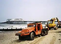 Many Second World War half-tracks were sold off to civilian users either as surplus stock or later due to obsolescence when the fully tracked armoured personnel carrier was introduced into service. Most were used in engineering-related tasks involving terrain that would be difficult for even four-wheel drive trucks, such as snow, sand and water-logged soil. Many were significantly modified for their new roles, including being fitted with winches, small cranes, and generators after the rear cabin sides were removed.